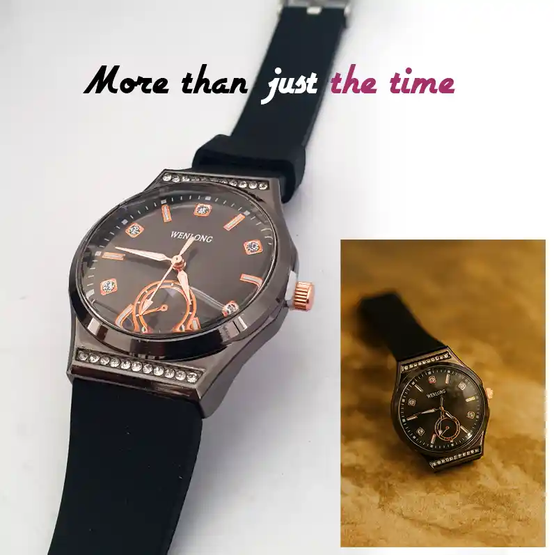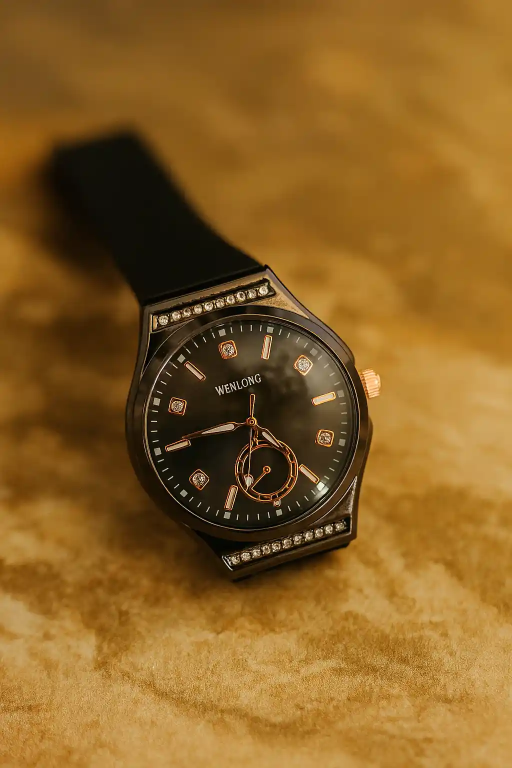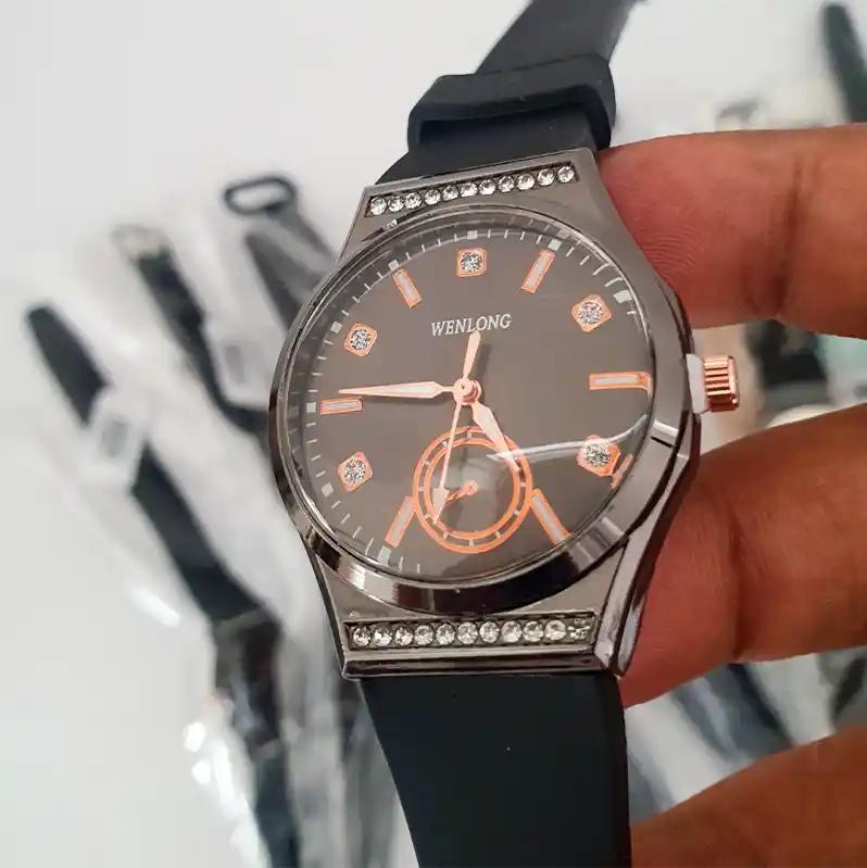 Add a touch of sophistication to your everyday style with this stunning WENLONG ladies’ watch. Designed with a sleek black dial and rose gold details, this watch perfectly blends modern elegance with timeless charm. Sparkling crystal markers and a diamond-studded bezel bring a luxurious shine, while the soft silicone strap ensures lasting comfort for all-day wear.