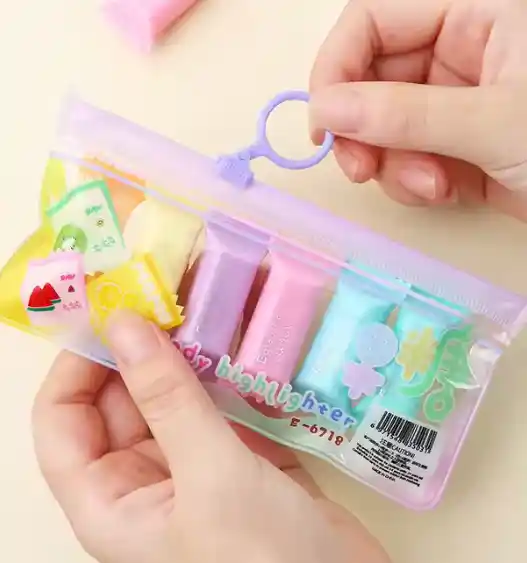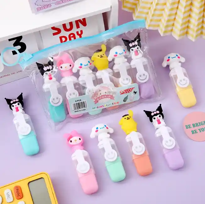 Bring a touch of fun to your notes with this adorable set of 6 highlighter pens! Each pen features a cute, popular Sanrio-inspired character on top, adding a playful and stylish element to your school or office supplies. The set includes a range of vibrant, eye-catching colors, perfect for highlighting important information in textbooks, notebooks, and planners.
