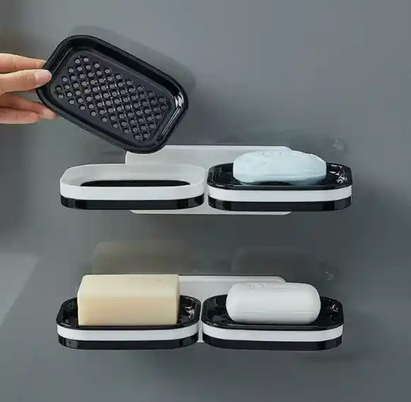 Keep your bathroom or kitchen tidy with this space-saving double-layer soap holder. Designed to mount on the wall, it features two separate compartments to hold soap bars, sponges, or scrubbers, freeing up valuable counter space.