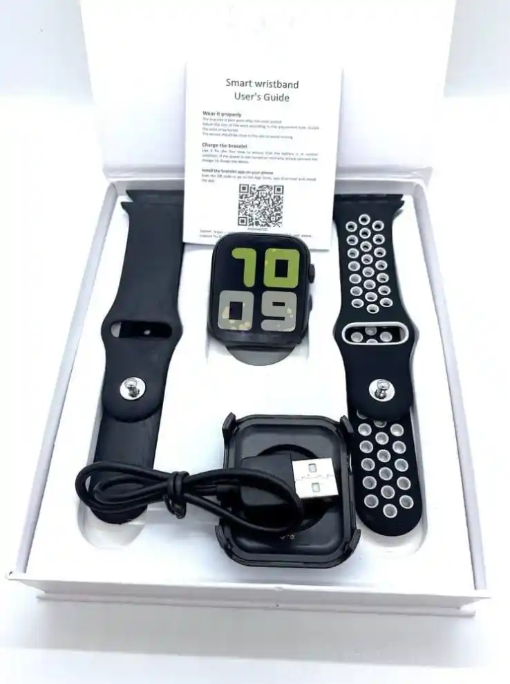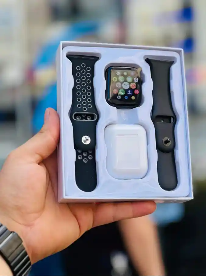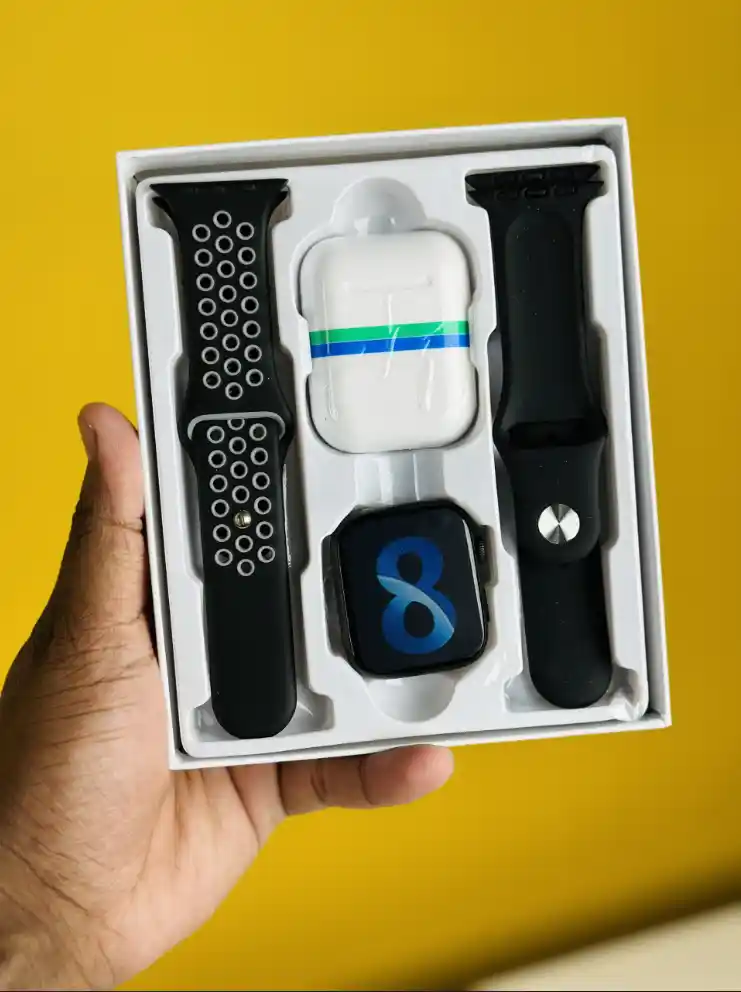 Upgrade your everyday look with this elegant Smart Watch Gift Set, designed for modern lifestyles. Packed in a premium box, this set includes a sleek smart watch, two interchangeable straps for sporty and classic looks, and a stylish wireless earbud case—making it a perfect all-in-one gift.